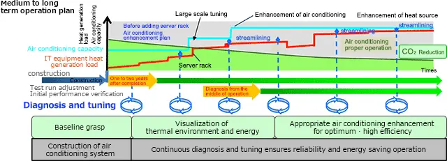 Green Air IDC es un servicio operativo para la optimización integral a lo largo del ciclo de vida de un centro de datos (IDC). En un IDC, la carga del sistema de aire acondicionado varía en intervalos cortos debido a la incorporación o sustitución de equipos informáticos. Diagnosticamos el entorno térmico y energético en condiciones operativas del IDC, y proporcionamos desde ajustes para ahorro de energía hasta planificación y diseño general para renovación, construcción y servicio postventa, todo en un único paquete integral. Contamos con más de 100 casos de validación tanto en Japón como en el extranjero.